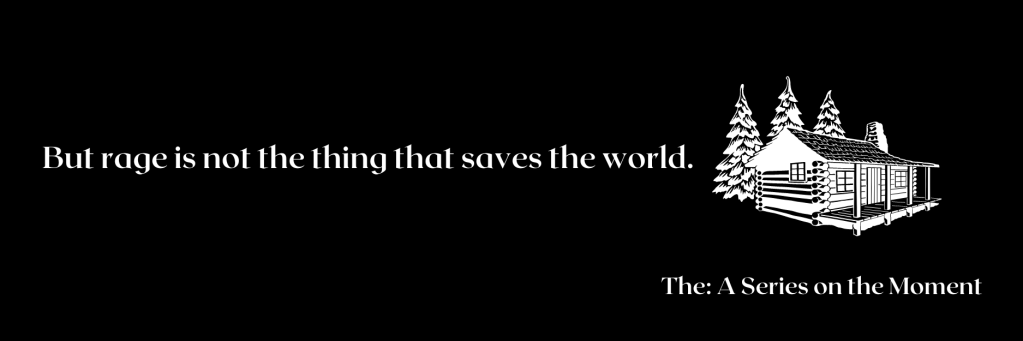 Don’t miss this, friends. Rage cannot save any of us. Rage is balm for the suffering, a reminder that they are seen. Rage is a warning to repentance, a reminder to The Tyrant that human authority is just animated dust waiting, again, to crumble. Rage is important. Rage is necessary. Rage is not the thing that saves the world.
